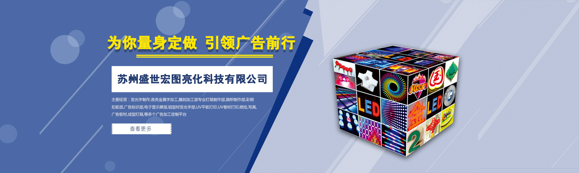 苏州盛世宏图亮化科技有限公司是一家集广告加工制造,广告材料销售,配送于一体的大型广告制造公司.